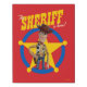 This Disney/Pixar's "Toy Story 4" graphic features Woody within a star badge shaped frame, with the words "The Sheriff Is Here!".