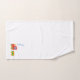 Colorful child's bath towel set featuring a red, blue, yellow and green toy train pattern. The wash cloth is done in a coordinating striped pattern and the hand towel is white with one train, in the corner and personalized with blue text.