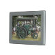 A photographic design of a green vintage steam traction engine.