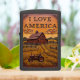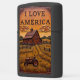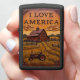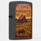 This lighter features a high-relief farm scene with a small red tractor. The scene includes a large rustic barn and wooden fences surrounding fields of tall grass and crops. The background has rolling green hills under an orange sky. The text "I LOVE AMERICA" is prominently featured in a banner at the top. The background landscape has a luxurious, soft-leather look. This artwork highlights the simple, yet profound acts of comfort and support provided by farming professionals, symbolizing warmth and peace. The highest quality print and artwork used on the surface is so exceptional it creates a stunningly realistic tactile illusion; you could easily mistake the textures for genuine leather. The entire design is set on a matte black lighter casing. The design may look real due to the high detail in the artwork.