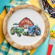 Farm birthday party paper plates. Two tractors sit in front of a red barn in this design. Choose round plates or bowls and the edge is bordered in golden hay.