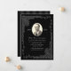 Traditional European death announcement, elegantly done, with a black and gray art deco style background. An oval photo area, at the top, is customizable to add in your loved one's photograph. Personalize all the text to suit your needs. Can be used as a funeral mourning card too. Matching black lined envelopes available.