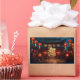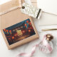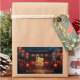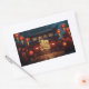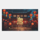 A Chinese temple at night with traditional lanterns as background for a golden Dragon with ideogram paper-cut, 2024 (customizable) and golden "year of the Dragon". Design on rectangular sticker. Matching greeting card.
