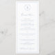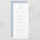 Simple dusty blue wedding menu with your monogram in a circle at the top and your menu options surrounded by a thin border. The header and your names are in an elegant handwritten script font. The classic, traditional layout makes this menu great for a formal winter wedding.