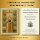 Elegant Catholic First Communion keepsake featuring a vintage devotional image of the Elevation of the Host during the Holy Sacrifice of the Mass. The priest, robed in traditional Roman vestments, raises the Sacred Host bearing the IHS monogram, surrounded by adoring angels and radiant light from the Cross. This classic and reverent design is paired with personalized details of the communicant’s special day, the parish, and celebrant. A perfect remembrance for this sacred sacramental milestone.