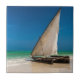 Traditional fishing boat on a white sand beach in Zanzibar, Tanzania.