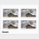 Rectangular photo sticker of a traditional wooden log cabin house with green shutters in a forest in the snow in winter in Bavaria at the border between Germany and Austria.