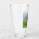 Pint glass for beer and other cold beverages that features a scenic photo image of a colorful rainbow arcing across a green valley along with a traditional Irish blessing printed in a green Celtic style lettering.