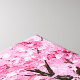 Serene depiction of a traditional Japanese garden featuring stunning cherry blossom trees, architectural wooden structures, and flowing water streams below a wooden footbridge in a tranquil and picturesque setting.
