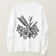 A traditional Sailor Jerry-style flash tattoo featuring a comb and shears as the central elements. The bold black-and-white design is adorned with classic floral accents and a flowing ribbon, exuding timeless barber culture. The minimal shading and clean lines make it a perfect choice for t-shirt designs, set against a light background to enhance its vintage charm