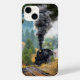 color image of an approaching steam train on the train tracks billowing gray smoke from its stack