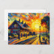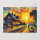 The image depicts a vibrant and colorful painting of a train station at what appears to be sunset or sunrise. The sky is filled with swirling patterns of yellow, orange, blue, and red hues that reflect onto the railway tracks and the station platform. The station building is labeled “Bahnhoft,” and there are several figures on the platform, some standing and some walking. Trees line one side of the tracks, bending slightly as if blown by the wind. The style is reminiscent of Vincent van Gogh’s post-impressionist works, with bold colors and dynamic brush strokes creating a sense of movement throughout the scene.