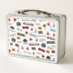 Add a cute train theme to your child's school day with this adorable custom railroad pattern lunchbox. Lunch box has trains, train tracks, railroad signs, and gates. Add the first name of your little kid for a personal touch. The Choo Choo text is also editable.