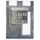 An art design of old door of the booking office on the train station platform with a warning of no admittance and beware of the trains from the steam train era.