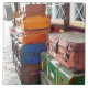 A simple watercolor design of a train station during wartime. Suitcases stacked on the platform waiting for the steam train to transport them to their destination. England.