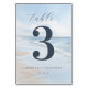This wedding table card features a serene beach scene with gentle waves and a soft blue sky, creating a tranquil and inviting atmosphere. The design showcases a large numeral "3" in bold navy, complemented by elegant cursive typography for the word "table," while customizable placeholders allow for personalization with names and dates. The minimalist style emphasizes clean lines and open space, enhanced by a watercolor effect that adds a dreamy quality to the seaside backdrop. Perfect for adding a touch of sophistication to your special occasion, this card captures the essence of relaxation and celebration.