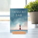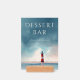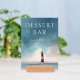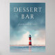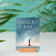 This wedding tabletop sign features a serene lighthouse design with a gradient sky transitioning from soft blue to light hues near the horizon, creating an inviting atmosphere. The central red and white striped lighthouse stands out against the calm backdrop, mirrored on a reflective surface below for added depth. Elegant typography at the top reads "DESSERT BAR" in bold serif letters, followed by "please take a treat" in a gentle sans-serif font, enhancing the welcoming vibe. Perfect for guiding guests to sweet treats, this sign combines tranquility and charm, ideal for any beachy or coastal-themed celebration.