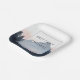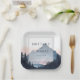 This wedding plate features a serene nature-inspired design with a watercolor-style mountain landscape in soft blue, gray, pink, and purple hues. The composition includes silhouetted pine trees at the bottom, creating depth against the dreamy sky. Central to the design is customizable text framed by a double-lined border, using bold serif fonts for names and a cursive script for "and," set against a calming backdrop. The overall style blends realism and impressionism, evoking a peaceful and romantic mood perfect for celebrating your special day.