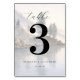 This elegant wedding table card features a serene nature-inspired design with soft watercolor illustrations of pine trees and rocky terrain, creating a tranquil atmosphere. The color palette includes muted earth tones like light blues, grays, and greens, enhancing the calming mood. A large, bold numeral "3" serves as the focal point, complemented by an elegant cursive script above and clean sans-serif typography below for customization. The minimalist aesthetic emphasizes simplicity and sophistication, making it perfect for formal occasions.