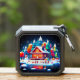 The subtle glow of small lights around the window accents the cozy ambiance of the wooden house, while the snowman joyfully stands at the gate, exhaling warmth into the air, symbolizing the joy and happiness of the season.