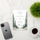 This wedding invitation features a serene, nature-inspired design with a vertical layout and symmetrical illustrations of evergreen trees framing the central text. The color palette includes soft greens and pale blues, creating a tranquil atmosphere reminiscent of a watercolor painting. Elegant script typography highlights the couple's names, while clean serif fonts provide additional details, all set against a light cream background for a timeless and harmonious look. Perfect for couples who appreciate botanical elements and a peaceful, inviting mood, this design captures the essence of celebrating love in a natural setting.