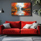 This painting captures a breathtaking autumn landscape featuring a serene lake surrounded by vibrant fall foliage. The golden and crimson leaves of birch and maple trees contrast beautifully against the cool blue waters, which reflect the brilliant colors of the season. Snow-capped mountains rise in the distance, adding depth and grandeur to the scene. Floating leaves gently drift across the lake’s surface, enhancing the peaceful and poetic atmosphere. The crisp air and warm hues evoke a perfect autumn day in nature’s embrace.