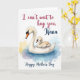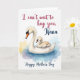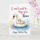 This design shows a serene scene of a large white water bird gliding across calm, painted water, its long neck curving gently as if leaning close to its little one ❤️. A fluffy young bird with golden-brown feathers rides on the adult’s back, and their dark eyes meet in a tender, trusting way that suggests closeness and care. The beaks are tipped in warm orange, adding small bright accents against the soft white plumage. Behind them, airy washes of pale blue, lavender, and muted golden tones blend together like morning light over a quiet pond. Fine ripples spread outward from the bird’s body, giving the water a slow, soothing sense of motion. Near the top, a message is placed above the pair in two colors—crimson for the first line and deep navy for the next—set in flowing, cursive lettering 🌼. Near the bottom, a shorter greeting appears in matching deep navy, centered beneath the birds. The background stays softly blurred with watercolor-like edges, while the birds remain the sharpest details in the scene.