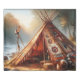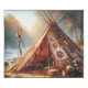 Nestled by a flowing river, a native Indian teepee stands proudly among lush trees and majestic mountains, inviting peaceful reflections and a deep connection with nature's beauty.