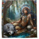 Nestled by a gentle river, a native Indian woman, adorned in intricate accessories, peacefully interacts with a calm, resting wolf. The lush greenery and soft light create a mystical ambiance that highlights the bond between nature and spirit.