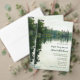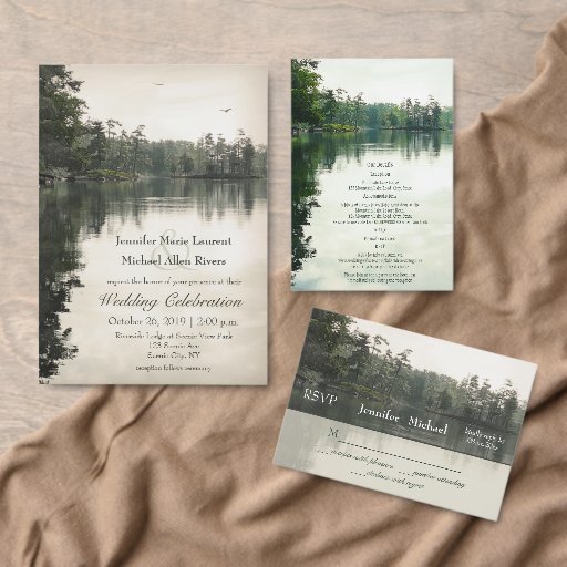 This rustic evergreens wedding thank you note card features the tranquil image of calm water reflecting distant evergreens and rocky structures | slight ripples can be seen on the water under overcast skies | created from my own paddling photograph | part of the Mountain Lake Rustic Wedding Collection by katz_d_zynes >> https://www.zazzle.com/collections/119499271518309609
