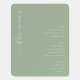 This elegant wedding menu card features a minimalist design with a soft sage green background, creating a calming and sophisticated aesthetic. The layout is clean and organized, with the title "bar menu" written in an elegant cursive script on the left side, while the right side lists categories of drinks—beer, wine, and spirits—in a neat sans-serif font. The muted color palette and ample negative space enhance readability and emphasize simplicity, making it perfect for couples seeking a chic yet uncluttered look for their special day.