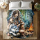 On a tranquil riverside, a Native Indian woman sits gracefully beside a majestic wolf. Adorned in traditional attire and feathers, she connects deeply with nature, while a gentle fire flickers behind them, casting warm hues over the peaceful scene.