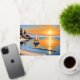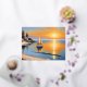 This postcard features a serene beach scene at sunset. A sailboat peacefully drifts on the calm waters, with its sails reflecting the warm hues of the setting sun. The sky is painted in shades of orange and yellow, casting a golden glow over the landscape. The beach is quiet, with gentle waves lapping against the shore. In the distance, there are a few trees and a house nestled among the greenery. Overall, it's a tranquil and picturesque view of a coastal sunset.