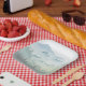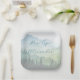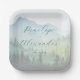 This wedding plate features a serene, nature-inspired design with a soft watercolor aesthetic. The layout showcases misty mountain peaks and a dense forest of pine trees in cool tones of light teal, soft green, and pale blue, creating a tranquil atmosphere. Elegant script typography highlights the names, while a clean sans-serif font presents the date, adding sophistication to the minimalist style. Perfect for celebrating your special day, this design evokes calmness and elegance, making it an ideal choice for a peaceful and memorable occasion.