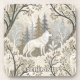 This serene winter forest coaster features a majestic white wolf at its center, surrounded by snow-dusted trees in soft tones of cream, brown, grey, and pale blue. A second wolf is subtly nestled in the lower corner, hinting at unseen life within the quiet woodland. With a mix of bare-branched and evergreen trees, framed by delicate decorative elements, this design evokes natural beauty, stillness, and a touch of winter magic. Perfect for nature lovers, animal enthusiasts, and seasonal or fantasy-themed settings.