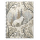 This serene winter forest spiral notebook features a majestic white wolf at its center, surrounded by snow-dusted trees in soft tones of cream, brown, grey, and pale blue. A second wolf is subtly nestled in the lower corner, hinting at unseen life within the quiet woodland. With a mix of bare-branched and evergreen trees, framed by delicate decorative elements, this design evokes natural beauty, stillness, and a touch of winter magic. Perfect for nature lovers, animal enthusiasts, and seasonal or fantasy-themed settings.
