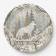 This serene winter forest paper plate features a majestic white wolf at its center, surrounded by snow-dusted trees in soft tones of cream, brown, grey, and pale blue. A second wolf is subtly nestled in the lower corner, hinting at unseen life within the quiet woodland. With a mix of bare-branched and evergreen trees, framed by delicate decorative elements, this design evokes natural beauty, stillness, and a touch of winter magic. Perfect for nature lovers, animal enthusiasts, and seasonal or fantasy-themed settings.