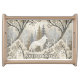 This serene winter forest serving tray features a majestic white wolf at its center, surrounded by snow-dusted trees in soft tones of cream, brown, grey, and pale blue. A second wolf is subtly nestled in the lower corner, hinting at unseen life within the quiet woodland. With a mix of bare-branched and evergreen trees, framed by delicate decorative elements, this design evokes natural beauty, stillness, and a touch of winter magic. Perfect for nature lovers, animal enthusiasts, and seasonal or fantasy-themed settings.