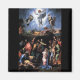 The Transfiguration is considered the last painting by the Italian High Renaissance master Raphael ( Raffaello Sanzio ). It was left unfinished by Raphael, and is believed to have been completed by his pupil, Giulio Romano, shortly after Raphael's death in 1520. The picture is now housed in the Vatican Museum ."Transfiguration" can be considered a prefiguration of both Mannerism, as evidenced by the stylised, contorted poses of the figures at the bottom of the picture; and of Baroque painting, as evidenced by the dramatic tension imbued within those figures, and the strong use of chiaroscuro throughout.The composition is divided in two distinct parts, relating to successive episodes of the Gospel of Matthew. The upper part of the painting shows the Transfiguration itself (on Mount Tabor, according to tradition), with the transfigured Christ floating in front of softly illuminated clouds, between the prophets Moses and Elijah with whom he is discoursing as recorded in the account of Matthew. The two figures kneeling on the left are the martyrs Saint Felicissimus and Saint Agapitus who shared August 6th as a feast day with the Feast of the Transfiguration.In the lower part, Raphael depicts the Apostles attempting, unsuccessfully, to free the possessed boy of his demonic possession. They are unable to cure the sick child until the arrival of the recently-transfigured Christ, who performs a miracle.