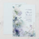 Surround your wedding details with the ethereal and modern beauty of this digital botanical illustration. This design features large, translucent blossoms in soft periwinkle and lavender, characterized by delicate, radiating fine lines within the petals. These focal blooms are complemented by smaller deep blue wildflowers and sprigs of tiny white fillers, creating a lush and organic feel. The arrangement is set against a dreamy, misty blue and white watercolor wash background, with soft sage green leaves adding natural depth. Every detail is rendered with high-definition clarity to provide a serene and romantic aesthetic for your big day. This botanical layout is an impeccable choice for a modern garden wedding or a serene spring ceremony. The cool periwinkle and sage color story makes it a flawless fit for an elegant outdoor bridal shower, a romantic engagement party, or a chic morning wedding reception. It pairs beautifully with wedding themes like modern organic, fine-art botanical, or minimalist romantic, and coordinates perfectly with slate blue, champagne gold, and crisp white accents.