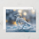 Transparent bird ice sculpture on snowy ground and distant christmas lights. Winter wonderland.