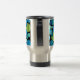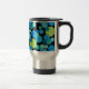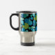 A vibrantly coloured Travel Mug with a 'Blue Moons' abstract pattern in bright blues and neon green on a black background; from a handpainted paper collage design by Judy Adamson.