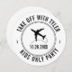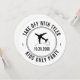 Personalized travel theme party sign with a black and white airplane monogram, date, and custom location text.