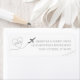 Modern Minimalist Travel Theme Return Address Label for a destination wedding or travel theme bridal shower with a retro inspired esthetic shown in gray and white typography with an airplane heart trail wedding monogram logo in the corner. Colors and fonts are editable so you can use this template to match your exact travel theme reception suite.
