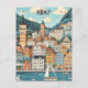 This travel postcard, in digital illustration style, is inspired by the city of Bergen, Norway.