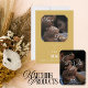Announce your special wedding day in elegant style with this travel themed Save the Date card, featuring a luxurious gold background that adds a touch of sophistication to your wedding plans. The front and back of the card offer customizable photo upload options, allowing you to showcase your favorite moments and personalize the card fully. The design centers on a simple white image of two airplanes forming a heart, symbolizing your journey together. Inside this heart, you can add your initials for a unique, personal detail that truly represents your love story. You can also include your custom wedding details with ease, making sure guests have all the important information at their fingertips. Additionally, the card features an option to announce a custom wedding hashtag, encouraging guests to follow event updates and share their favorite photos on social media — creating an interactive and connected celebration. Buying this card means not only investing in a beautiful and meaningful keepsake but also providing your guests with a fun and modern way to participate in your wedding journey from the very start. Its fully customizable features and elegant travel motif make this a perfect choice for couples looking to blend style, personalization, and digital engagement seamlessly.