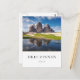 Photo postcard of the famous three peaks of the Tre Cime di Lavaredo or Drei Zinnen Dolomites mountain with reflection in the water of a puddle on a beautiful day in South Tyrol/Trentino Alto-Adige in Northern Italy with a white box with the text 'Drei Zinnen, Italy' and lines in green, white and red, the colors of the italian flag.
