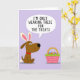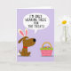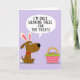 This card shows a friendly, humanlike dog in warm brown tones standing on the left against a light lavender background, wearing oversized bunny ears in white and pink 🐰. The dog’s wide eyes and dark snout angle toward the right, as if sharing a knowing look with the treat-filled basket it’s watching. A red collar adds a small romantic pop of color, like a shy hint of affection in an otherwise soft palette. Above the dog’s head, a white thought bubble holds the message “I’M ONLY WEARING THESE FOR THE TREATS.” in dark lettering, centered neatly inside the bubble. On the right side sits a woven pink basket with a green rim and a golden arch handle, arranged like a little offering between friends. The basket is packed with smooth, colorful round treats that read as candy or decorated eggs, adding a festive touch 🌷. A fluffy pale yellow tail puff peeks out behind the dog, and the open lavender field stays uncluttered around the main shapes.