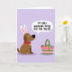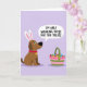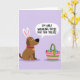 This design shows a brown dog sitting in profile on a flat lavender background, wearing tall white-and-pink bunny ears 🐰 as it looks toward a striped basket nearby. The dog’s round eyes and small curved smile give it a friendly, slightly teasing look, like it’s sharing a private joke with whoever set the basket out. The basket has pink and green bands and is filled with colorful egg-shaped treats in reds, blues, greens, yellows, and purples, adding a festive splash against the soft backdrop 🌷. A speech bubble points from the dog’s mouth area and contains uppercase text in dark lettering that reads, “I’M ONLY WEARING THESE FOR THE TREATS.” The humor in the message pairs with the dog’s patient posture, suggesting a loyal, affectionate willingness to dress up for someone else’s enjoyment. A small red collar with a gold tag sits at the dog’s neck, adding a cozy, cared-for detail. Gentle shading under the dog and the basket lightly anchors them to the lavender ground.