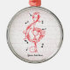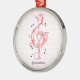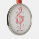 Red scrollwork sol note key custom ornament, featuring the sol note key in red scrollwork style and black notes.